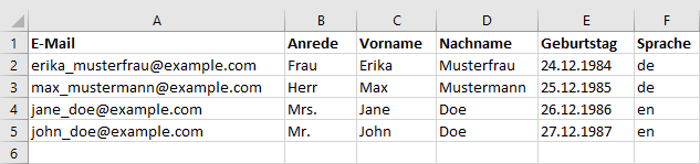 Abonnenten: ImportWahrscheinlich haben Sie bereits eine Liste von Adressen zusammengestellt, die Sie per Newsletter anschreiben möchten. Über das universelle CSV-Dateiformat lassen sich Ihre Adressen aus nahezu jeder Datenbank oder Tabellenkalkulation (z. B. Microsoft Office oder Open Office) exportieren und anschließend in mail@onlinedesign.eu importieren. Um die Zuordnung der Spalten (z. B. Vorname, Nachname, E-Mail) beim Import zu erleichtern, sollte die erste Zeile Ihrer CSV-Datei aussagekräftige Spaltenüberschriftten enthalten. Ein Beispiel: