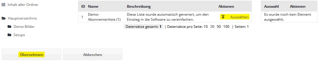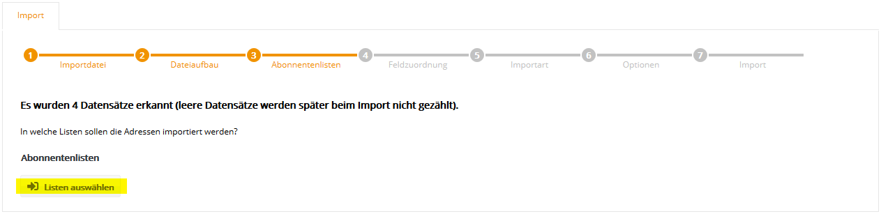 Schritt 3 - AbonnentenlistenWählen Sie nun aus, in welche mail@onlinedesign.eu Abonnentenliste ihre CSV-Datei importiert werden soll. Falls Sie zuvor keine eigene Abonnentenliste in mail@onlinedesign.eu angelegt haben (siehe Menü Abonnentenlisten), steht zum schnellen Einstieg die leere Abonnentenliste 'Demo-Liste' bereit. Diese Liste wird in der Regel bei der Einrichtung Ihres mail@onlinedesign.eu Kontos angelegt und zur Demonstration mit einem Beispiel-Abonnenten befüllt.