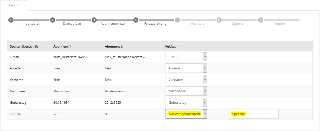 Auch die Auswahl mehrerer Abonnentenlisten ist möglich, falls Sie parallel in mehrere Listen importieren möchten. Klicken Sie nach Auswahl der gewünschten Liste(n) auf 'Übernehmen' und anschließend auf 'Weiter'. Der Name einer Abonnentenliste lässt sich im Menü Abonnentenlisten auch nachträglich jederzeit ändern. Schritt 4 - FeldzuordnungIn Schritt 4 teilen Sie mail@onlinedesign.eu mit, welche Spalte (z.B. Vorname, Nachname) Ihrer CSV-Datei in welches mail@onlinedesign.eu Abonnentenfeld importiert werden soll. Zum schnellen Einstieg sind typische Abonnentenfelder wie 'E-Mail', 'Anrede', 'Vorname' und 'Nachname' in mail@onlinedesign.eu bereits vorhanden.