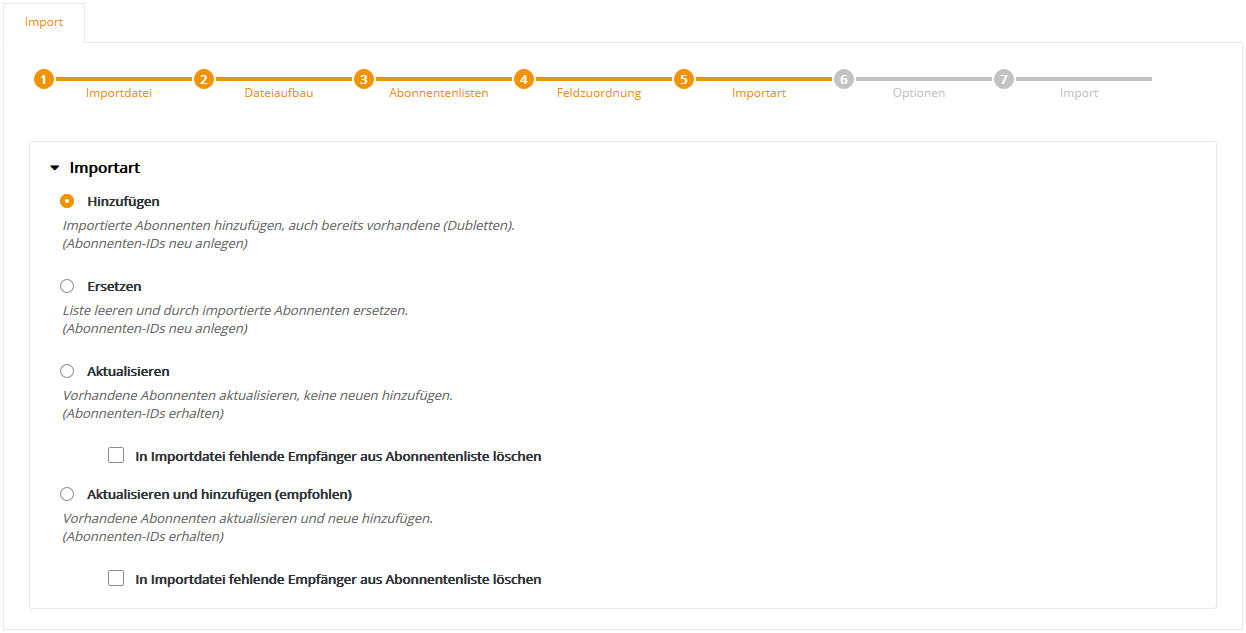 Auf der linken Seite sehen Sie am Beispiel der ersten beiden Abonnenten noch einmal den Inhalt Ihrer CSV-Datei. Auf der rechten Seite wählen Sie bitte den 'Feldtyp', der zum jeweiligen Inhalt passt. Dabei übernimmt mail@onlinedesign.eu die Zuordnung automatisch, wenn der Name von CSV-Spaltenüberschrift und mail@onlinedesign.eu-Abonnentenfeld übereinstimmt. Wird automatisch kein passendes Abonnentenfeld gefunden, ist der neue Feldinhalt zunächst auf 'nicht importieren' gesetzt. Wählen Sie in dem Fall entweder eines der vorhandenen Felder aus, oder nutzen Sie die Option 'neues Abonnentenfeld', um ein neues Feld anzulegen und ihm einen Namen zu geben. An dieser Stelle erhalten neue Felder grundsätzlich den Typ 'mehrzeiliger Text', siehe auch nachfolgender Tipp. Klicken Sie anschließend auf 'Weiter'. --> Tipp: Idealerweise sollten Sie sich bereits vor dem Import einmalig die Zeit nehmen, im mail@onlinedesign.eu Menü 'Abonnentenfelder' alle Felder so anzulegen, dass Feldname und Feldtyp zu Ihren importierten Daten passen. Damit profitieren Sie zukünftig von der automatischen Feld-Zuordnung, was bei wiederkehrenden Importen nicht nur Zeit spart, sondern auch eventuelle Fehler durch unpassende Feldtypen oder die manuelle Feld-Zuordnung verhindert. Schritt 5 - ImportartHier legen Sie fest, wie Ihre neu importierten Daten mit den vorhandenen 'alten' Daten der gewählten mail@onlinedesign.eu-Abonnentenliste(n) abgeglichen werden sollen.