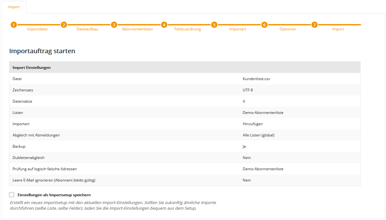 Anhand welcher Daten ein Abonnent als 'bereits vorhanden' erkannt wird (z.B. Kundennummer oder E-Mail Adresse), legen Sie anschließend in Schritt 6 - Optionen fest. Klicken Sie auf 'Weiter'. Schritt 6 - OptionenHier legen Sie die letzten Details zum Import fest.