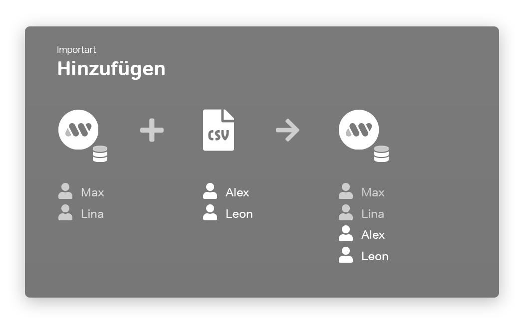 Es stehen vier verschiedene Importarten zur Verfügung, wie nachfolgend am Beispiel von Max und Lina ('alte' Daten) sowie Alex und Leon (neue Daten) demonstriert: --> Importart: HinzufügenAlle neuen Datensätze werden hinzugefügt, unabhängig von den vorhandenen Datensätzen. Alle alten Datensätze bleiben erhalten. Eventuell entstehende Dubletten lassen sich nachträglich per Dublettenabgleich entfernen. Im Beispiel würden Alex und Leon hinzugefügt, Max und Lina bleiben erhalten. |