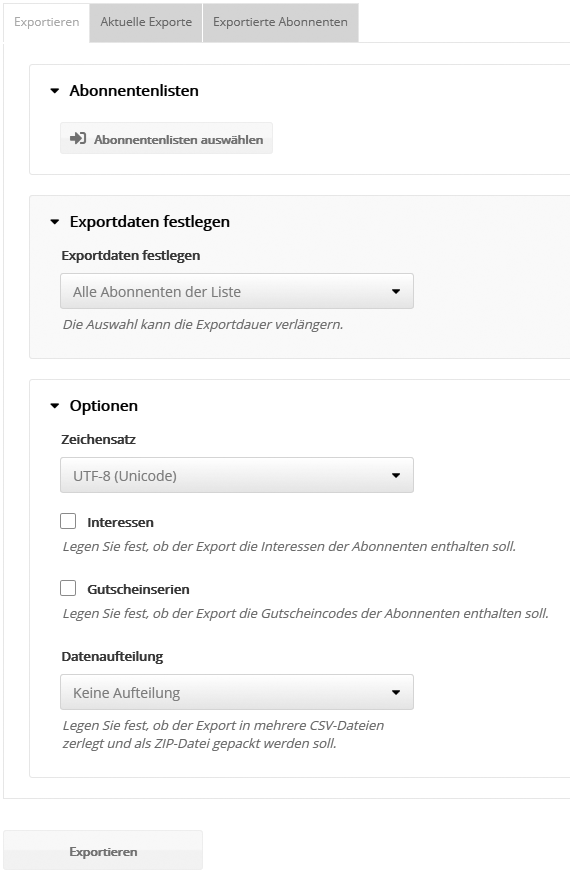 Abonnenten: ExportAbonnentenlisten lassen sich aus mail@onlinedesign.eu als CSV-Dateien exportieren. Damit können Sie lokale Backups Ihrer Abonnentenlisten anlegen oder den Inhalt bearbeiten und anschließend per Import-Methode 'Aktualisieren' erneut importieren.