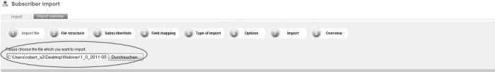 Save the file as a file with the feature 'CSV (Comma delimited)'. Apple user: If you own an apple computer, you will have to safe the file as 'CSV-Windows'. mail@onlinedesign.eu does not run files in the Mac format. Step 1 – Import fileOn the navigation bar click on 'Subscribers' and then go to the navigation subitem 'Import'. This is the way how you get to the menu-guided import function of mail@onlinedesign.eu. First, you will have to choose the file which you want to import; |