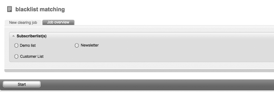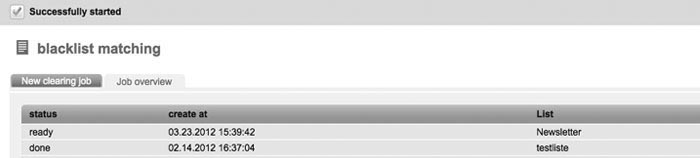 | You will find information on the blacklist and its function in 2.11 Blacklist. Via the function 'Blacklist matching', you can coordinate the data records of your subscriber lists with the entries in your blacklist. Detected subscribers will automatically be deleted by mail@onlinedesign.eu. First, you have got to choose the subscriber list which has to be examined. By clicking the 'OK' button, you will confirm the appearing message to delete the search results. The result will show you how many subscribers were removed due to the fact that they are registered in the blacklist. |