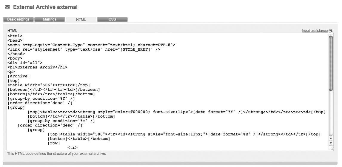 While creating your external archive, mail@onlinedesign.eu generates an html source code in the background, which defines the structure of your external archive. If you want to edit the look of your shown archive, you have to edit the source code, which requires appropiate HTML knowledge.