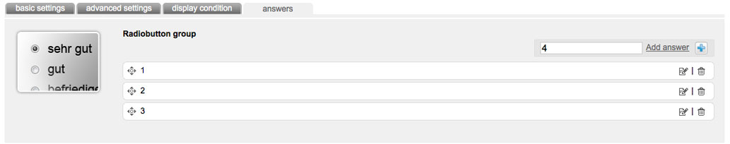 Please note: You can add a textfield to any answer for a free complementary response as well as linking a certain answer with an optin-setup (If a user enters a question with a certain answer, the optin-process will be started automatically). But realize, that this is just possible with question-type 'checkbox group' and 'radiobutton group'.