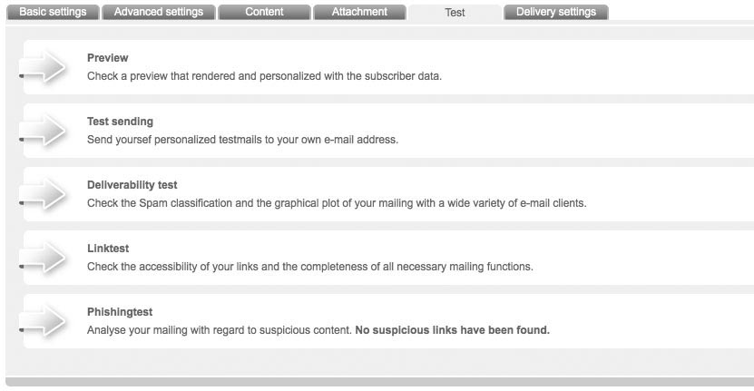 Having finished your newsletter, mail@onlinedesign.eu offers you numerous testing possibilities. This helps you to optimize your mailing and achieve maximum success before actual dispatch. You can get to the testing functions by choosing the tab 'Test' in the menu in which you edit your mailing. Following tests are available: |