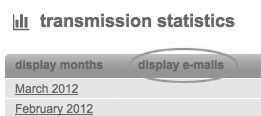 In the transmission- statistic you see the data collected from mail@onlinedesign.eu (Traffic, Total). Also you see, if exist, the numbers of test-sendings, clicks on the subsriber-link and the number of subscribers who have completed the optin-confirmation. Next to the view 'display months' you also can select 'display e-mails'. So mail@onlinedesign.eu outputs the above mentioned figures for each mailing.