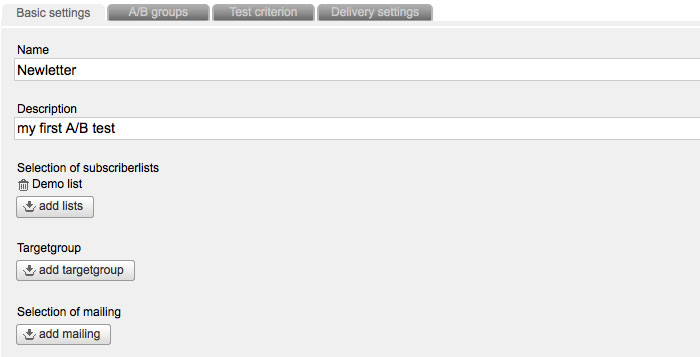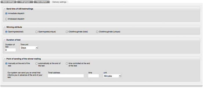 In the tab 'A/B groups' you can select the number and size of your test group. In the next tab you have to choose the 'test criterion'. Please select different subject lines, sender names, sender adresses or different sending point. Furthermore you are able to compare completely different newsletters. Of course you have to create the comparison mailing in the e-mail office at first.