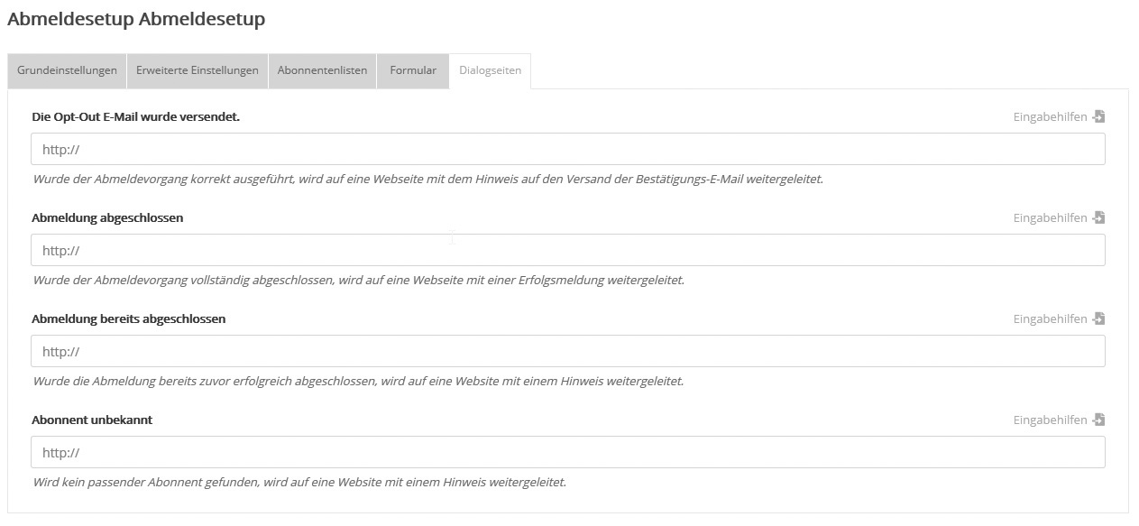 AbonnentenlistenJe nachdem, ob die Abmeldung per Newsletter-Link oder per Website-Formular stattfindet, wird der Abonnent aus folgenden Listen abgemeldet: Variante 1: Abmeldelink im NewsletterFür Standardmails gilt: Zusätzlich zu den auf dem Reiter 'Abonnentenlisten' gewählten Listen findet die Abmeldung auch in den angeschriebenen Listen statt. Für Kampagnen- und Dialogmails gilt dieser Zusatz nicht, da diese nicht an eine bestimmte Liste verschickt werden. Variante 2: Abmeldeformular auf WebsiteDie Abmeldung findet in den unter 'Abonnentenlisten' markierten Listen statt, und wenn vorhanden, dann auch in den direkt im Formular zur Auswahl durch den Nutzer angebotenen Listen (siehe nächster Abschnitt 'Formular'). Beides gleichzeitig ist nicht möglich. Das heißt: Sobald Sie eine Liste im Reiter 'Abonnentenlisten' markiert haben (und damit fest vorgeben), kann sie nicht gleichzeitig im Abmelde-Formular (ab)wählbar sein. Im dem Fall wird sie automatisch aus dem Formular entfernt und umgekehrt. Sonderfall beim Abmeldeformular: Ist keine Liste zur Abmeldung markiert und auch im Formular keine enthalten, dann findet die Abmeldung in allen Listen statt. Damit wird der Abonnent auch aus der 'Abonnentenverwaltung' entfernt. FormularHier erstellt mail@onlinedesign.eu automatisch den Quellcode für ein Abmeldeformular, das Sie auf Ihrer Website einbinden können. Den Inhalt des Formulars stellen Sie per Drag&Drop zusammen. Die Bedienung ist identisch zum Anmeldeformular-Editor. Nach Klick auf den Button 'Test des Formulars' wird Ihr neues Abmeldeformular angezeigt und die Funktion lässt sich anhand realer Abmeldungen testen. Geben Sie gültige und ungültige Abonnentendaten ein, um die entsprechenden Textmeldungen bzw. Dialogseiten zu prüfen. Ein während des Tests abgemeldeter Abonnent lässt sich unter 'Abonnenten' -> 'Abmeldungen' wiederherstellen. --> Hinweis zu Abmeldungen beim Testversand: Solange es sich um den Testversand eines Mailings handelt, findet bei Klick auf den Abmeldelink keine Abmeldung statt. Stattdessen wird lediglich eine Bestätigung angezeigt, ob das Abmeldesetup korrekt eingerichtet wurde. Erst beim späteren realen Versand findet eine tatsächliche Abmeldung statt und es erscheint die von Ihnen eingestellte Dialogseite, die Sie unter 'Formular testen' jederzeit testen können. Dialogseiten |